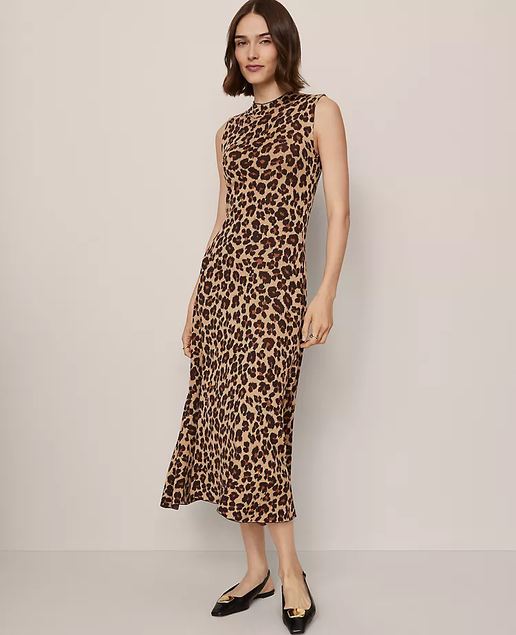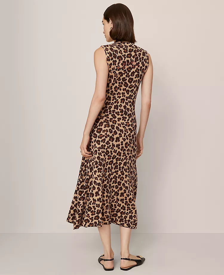Designed in a bold animal print, this versatile midi dress will effortlessly transition from day to night. Mock neck. Sleeveless. Hidden back-zip with hook-and-eye closure.