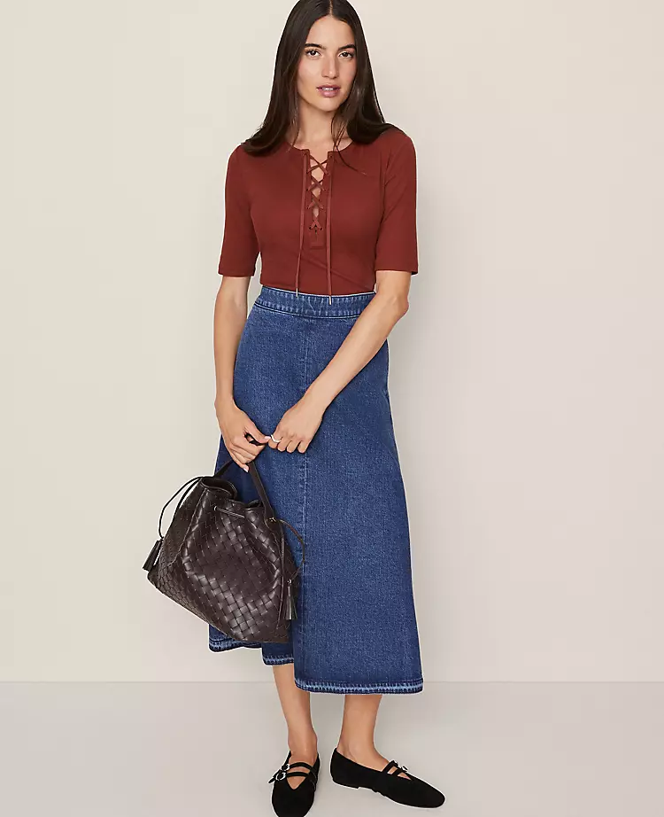 Elevate your casual wardrobe with the Ann Taylor Petite Weekend Collection. Designed for the modern woman who values both polish and comfort, this denim midi skirt offers a streamlined silhouette that transitions seamlessly from a morning coffee run to a relaxed dinner. The rich indigo wash provides a timeless look that pairs perfectly with your favorite tees or knit sweaters.
