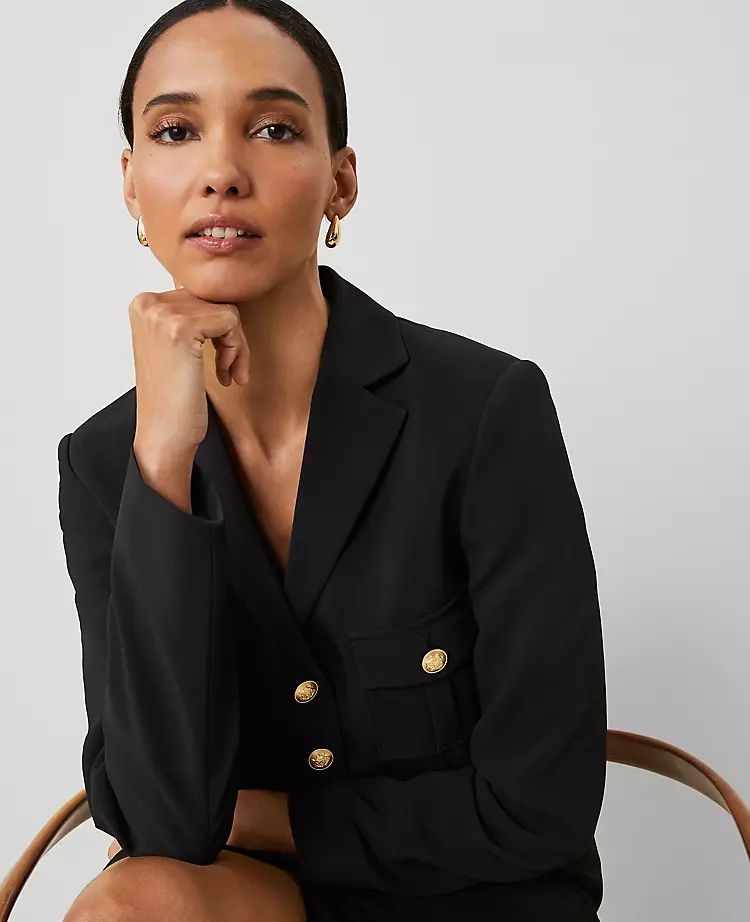Achieve a perfectly tailored silhouette without the bulk. This petite military-inspired blazer is designed specifically for shorter frames, offering a modern cropped cut that provides a sharp, professional look that never overwhelms your figure.