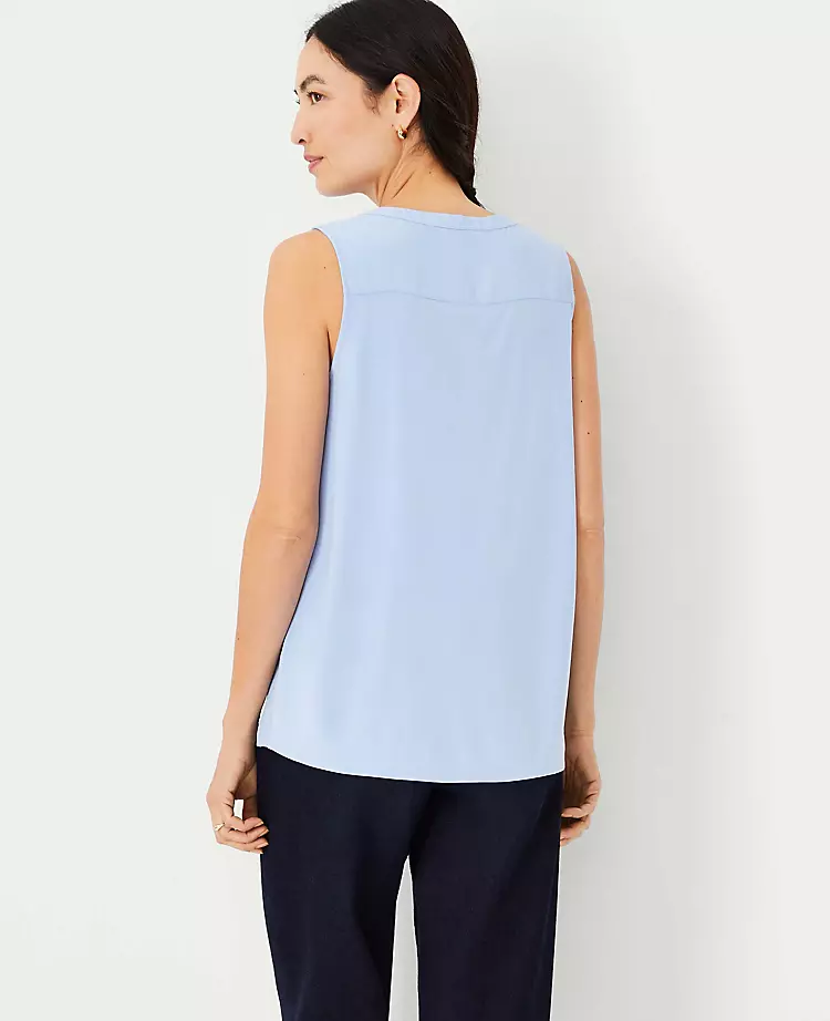 A cascading drape lends modern fluidity to this knit and woven shell. Jewel neck. Sleeveless. Hidden button front placket. Shirred forward shoulder seam. Back yoke. Woven front and back yoke. Knit back body.