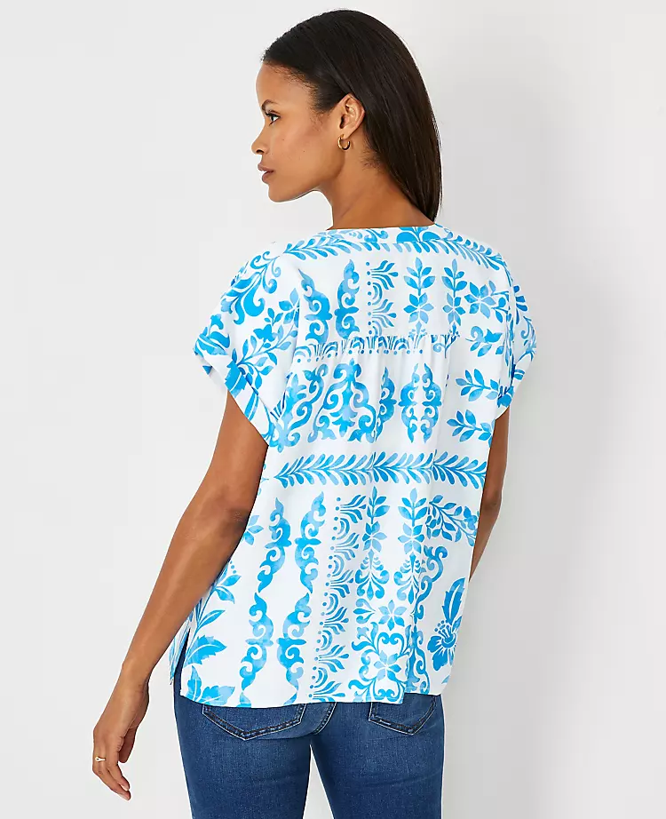 With a flattering drop shoulder silhouette, this refined popover is one of the season’s easiest (and most relaxed) toppers. Jewel neck. Dolman cap sleeves. Button front placket. Shirred forward shoulder seams and back yoke. Side slits.