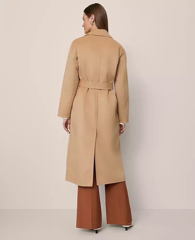 - Closure: Double-breasted front with a self-tie belt.
