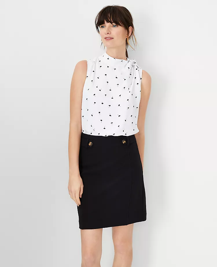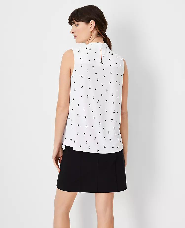 Add a pretty twist to your wardrobe with our mixed media shell, topped with an asymmetrical tie neck. Split neck with ties. Sleeveless. Shirred forward shoulder seams. Back slit with button closure. Woven front and ties. Knit back.