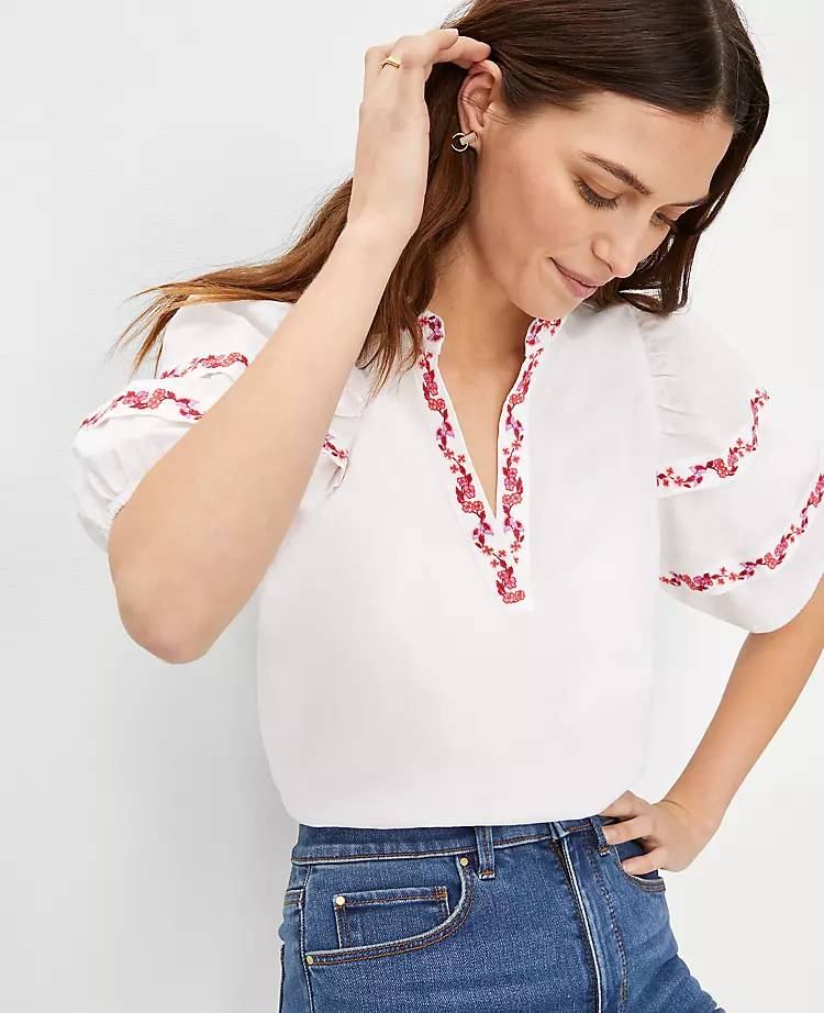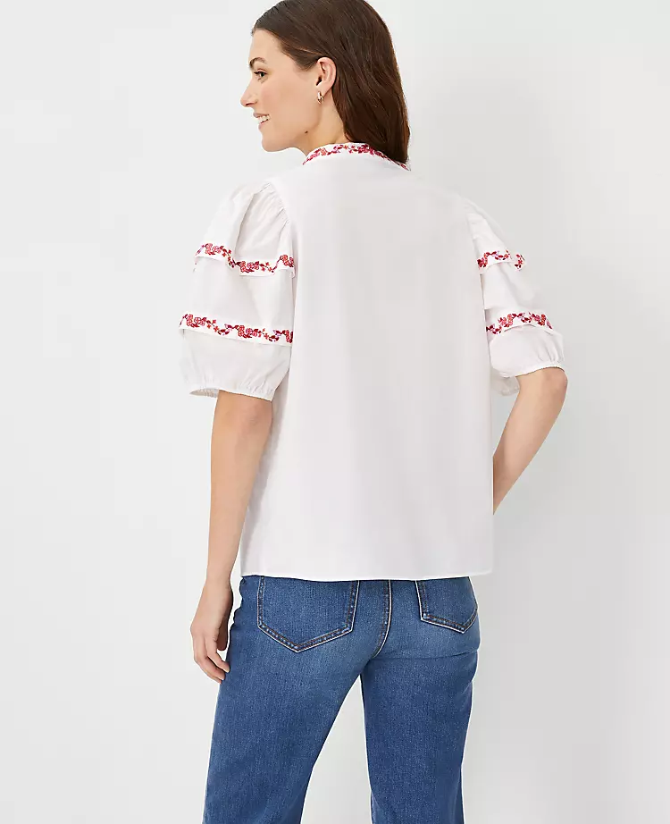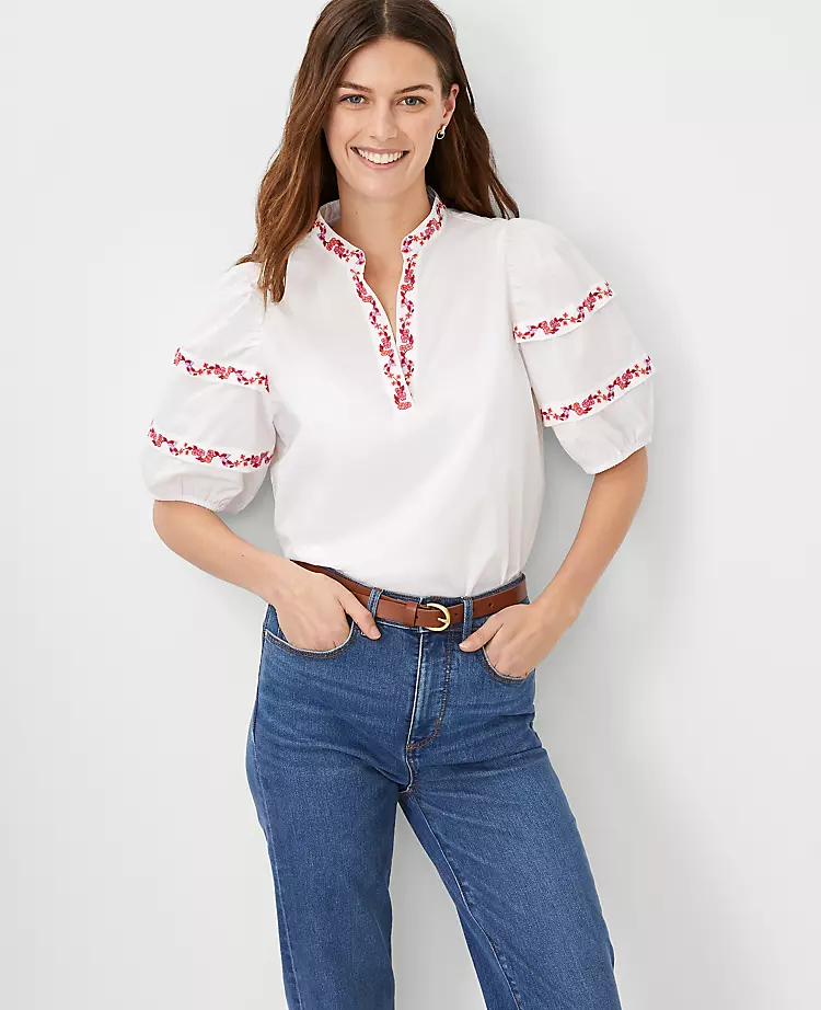 Embroidered trim adds a fresh thread to this pure cotton popover, prettied up with pintuck puff sleeves. Split neck. Short sleeves with pintuck sleeve caps and elasticized cuffs.