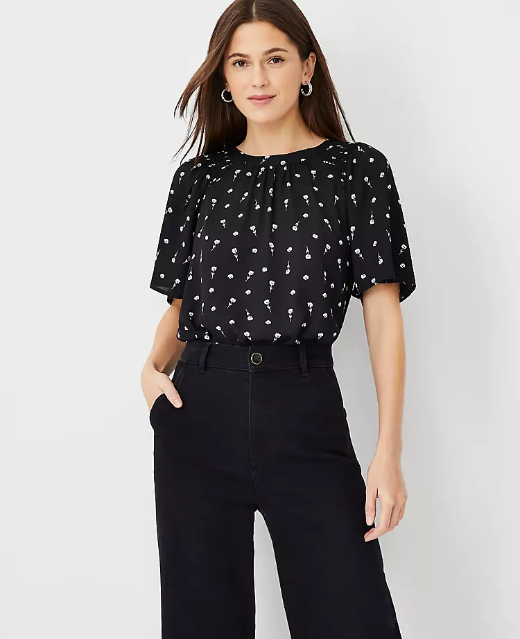 Flattering from day to night, our smocked neck top intrigues with light and refined texture. Shirred crew neck. Short smocked raglan sleeves. Back slit with hook-and-eye closure. Woven front and sleeves. Knit back.