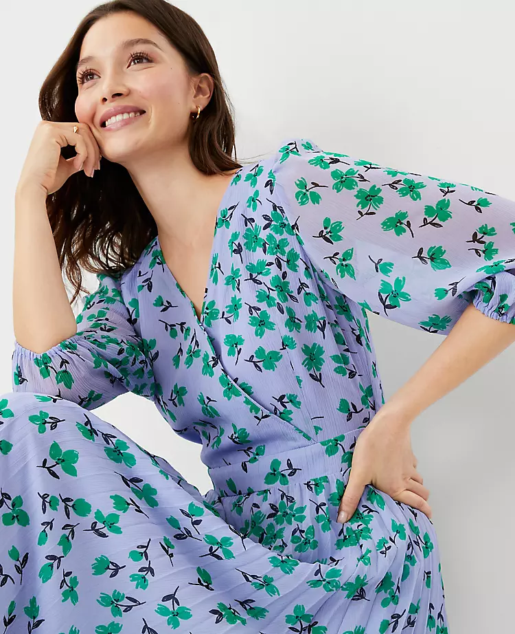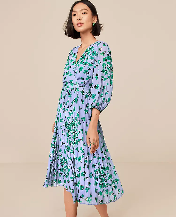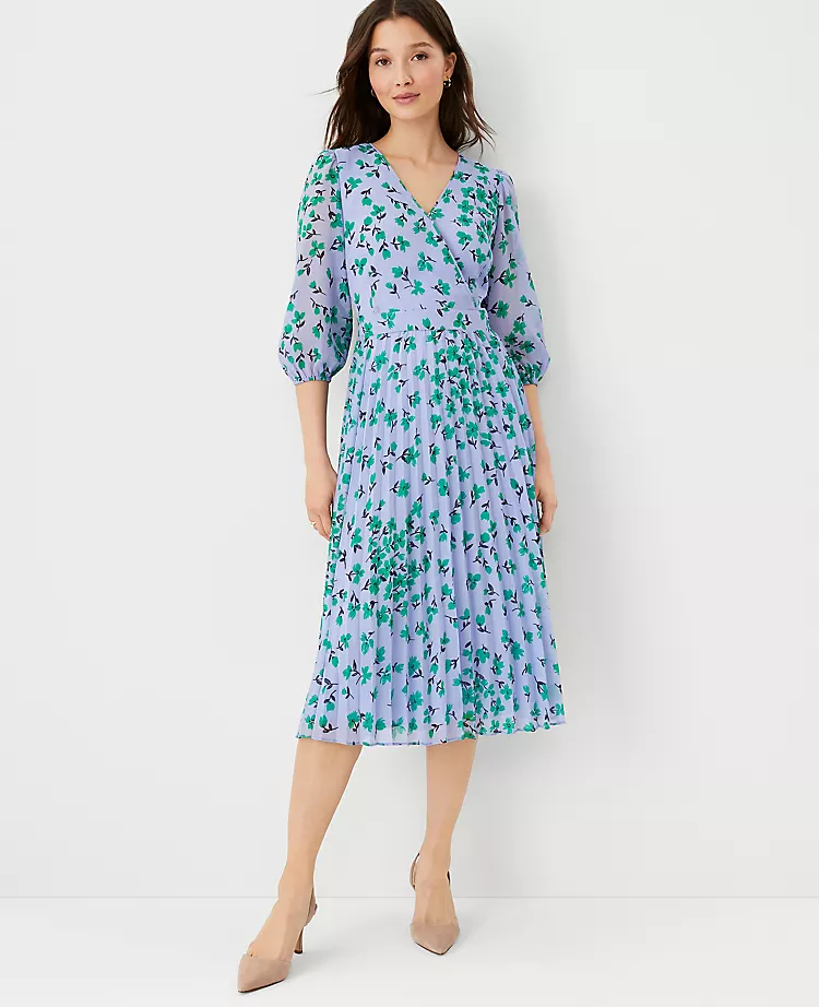 In lightly crinkled chiffon, our pleat skirt flare dress blooms with fresh-cut florals. Crossover V-neck. 3/4 sleeves with shirred sleeve caps and elasticized cuffs. Pleated skirt. Hidden back zipper with hook-and-eye closure. Lined body.