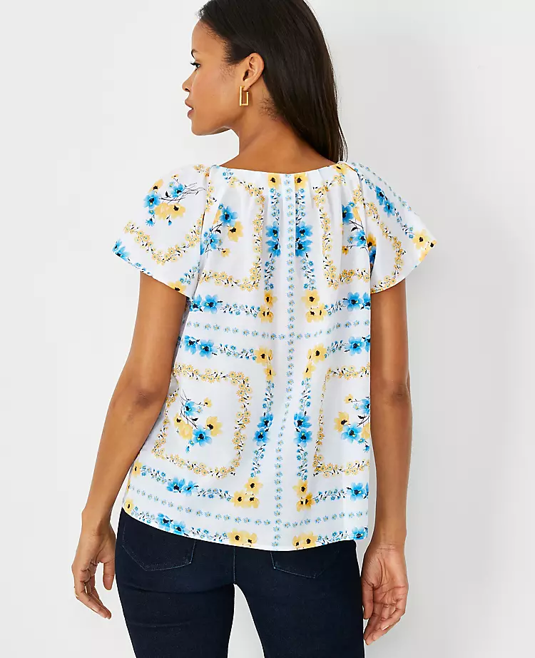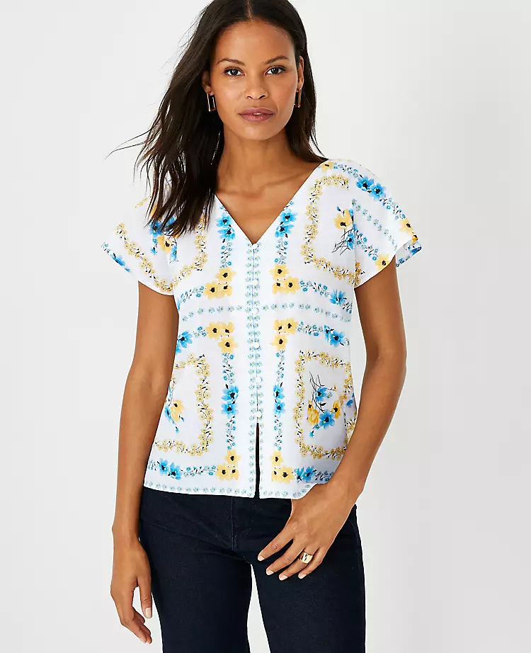 Embrace the ultimate in polished comfort with our pleat V-neck top, finished with a covered button front. V-neck. Short raglan sleeves with inverted pleat sleeve caps and tucks. Back neck box pleat with tucks.