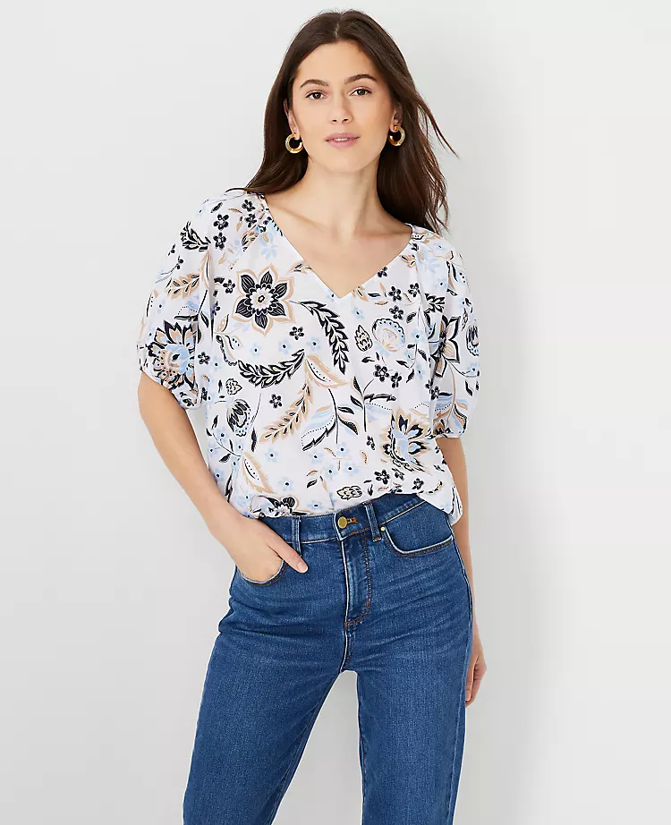 A sleek V-neck paired with puff tie sleeves equals feminine perfection – with a modern twist. V-neck. Short raglan sleeves with ties.