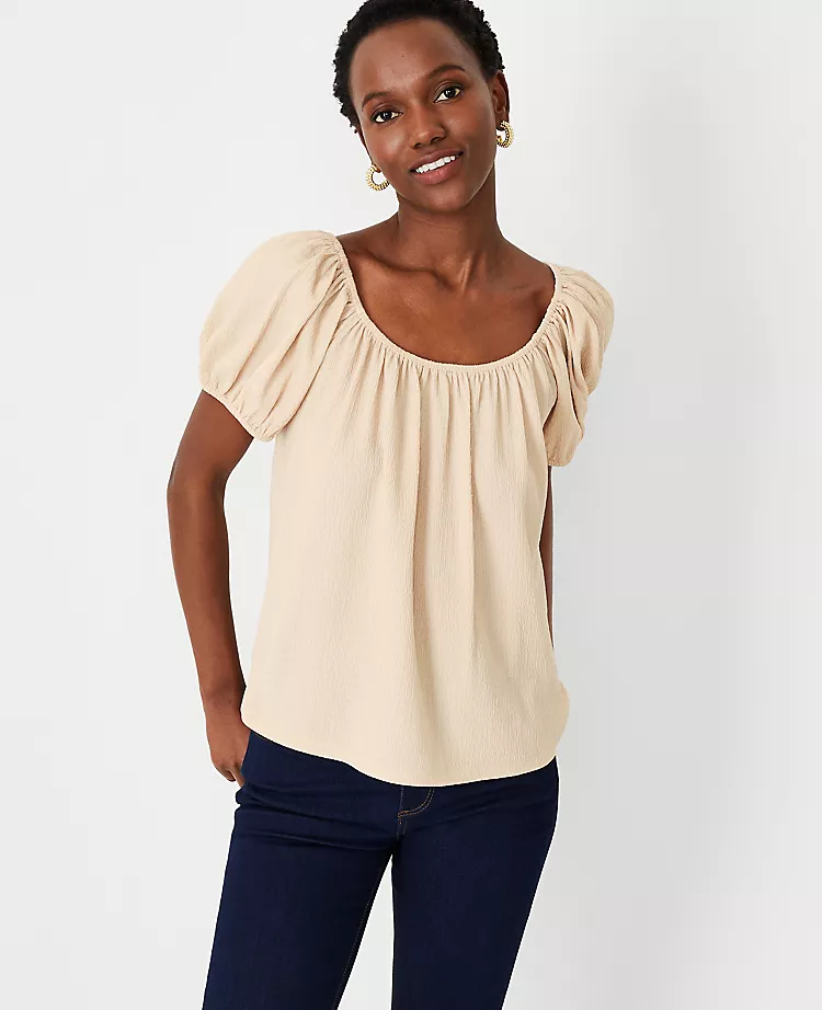 An artfully gathered neckline can dress up any outfit – any day of the week. Elasticized scoop neck. Short raglan sleeves with shirred sleeve caps.