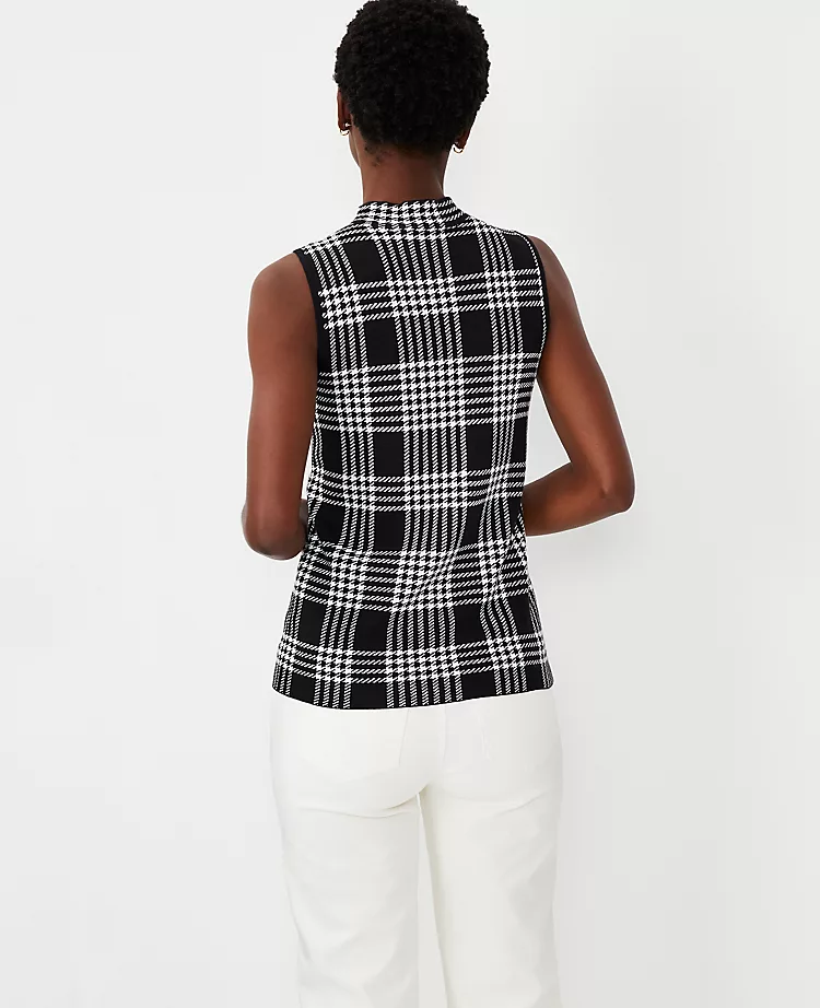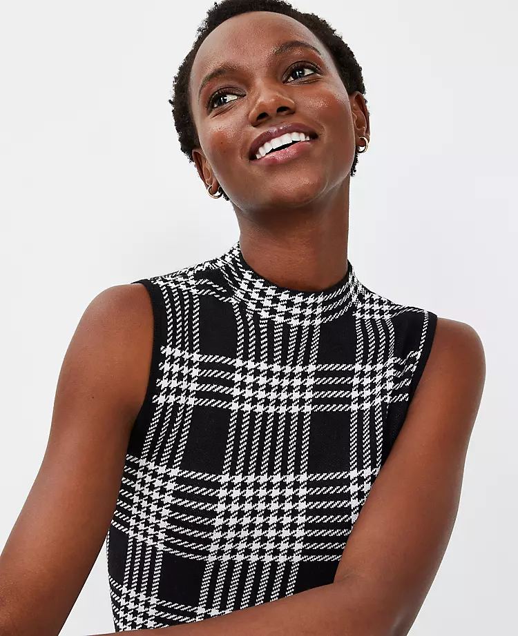 Styled with a flattering mock neck, this gingham sweater shell tops our season’s checklist. Mock neck. Sleeveless.