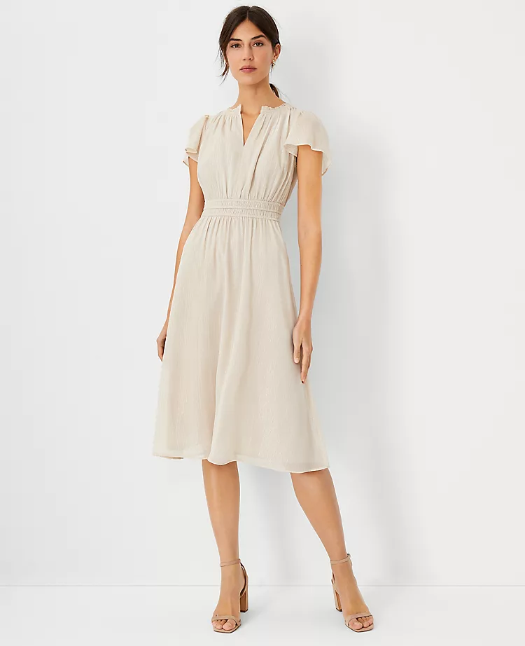 Finding the perfect dress that transitions seamlessly from office hours to evening events can be a challenge. Our Metallic Stripe Flutter Sleeve Flare Dress solves your wardrobe dilemmas with a sophisticated shimmering finish and a silhouette designed for ultimate comfort and charm.