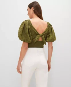 Petite Moss Green Eyelet Knotted Tie Back Blouse with Puffed Sleeves