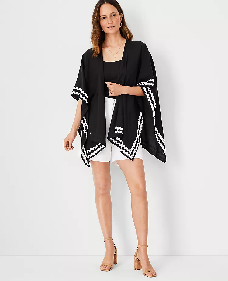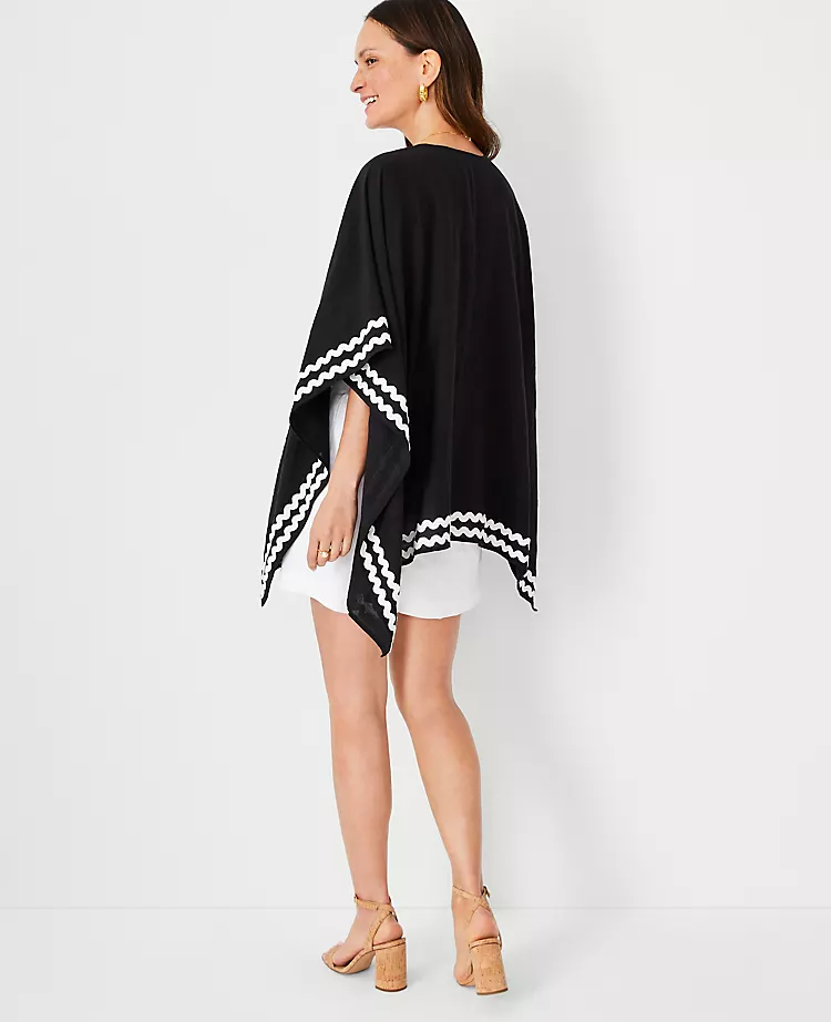 With modern drape and flow, our ric rac open poncho is a flattering layer that’s always at ease. Open front. 3/4 sleeves. 44″W x 29 1/2″L.