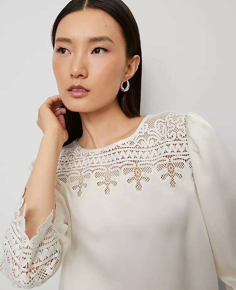Delicate lace detailing ups the feminine appeal of this fluid satin top. Crew neck. 3/4 sleeves.