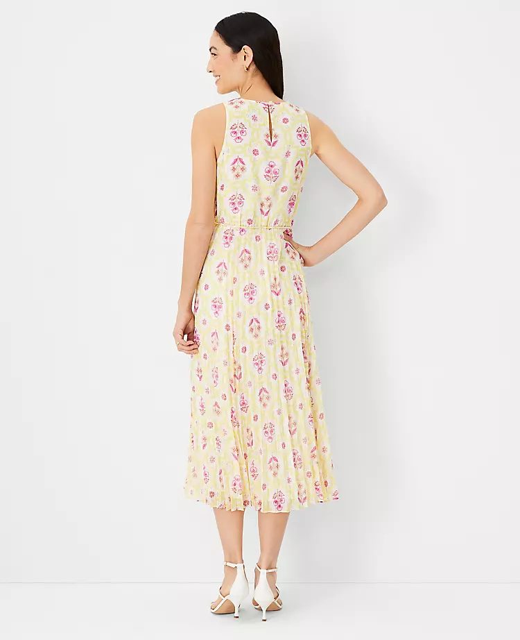 Lined up in subtly shimmery stripes, our tile print midi dress features a pleated skirt, for a sun-ready look that gets your day in full swing. Jewel neck. Sleeveless. Elasticized waist with self ties. Back slit with button closure. Lined.