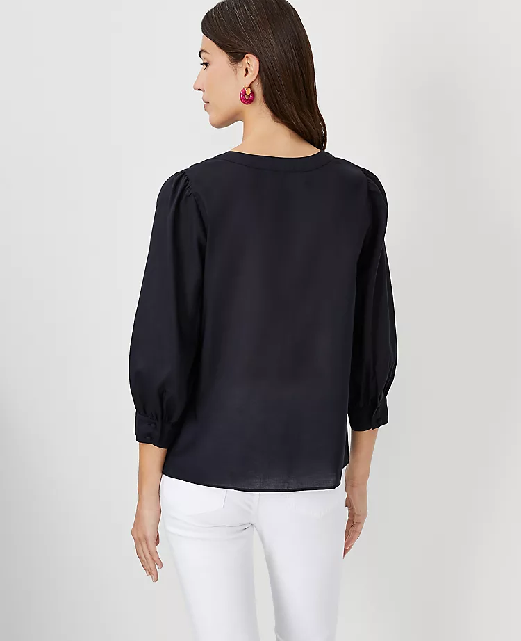 Shirred with an easy pull-on silhouette, our split neck top goes with just about anything. Split neck. 3/4 sleeves with shirred sleeve caps and button cuffs.