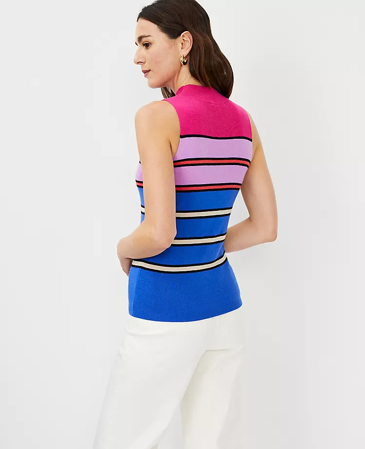 Topped with a flattering mock neck, our striped sweater shell is lined up with bands of bold color. Mock neck. Sleeveless