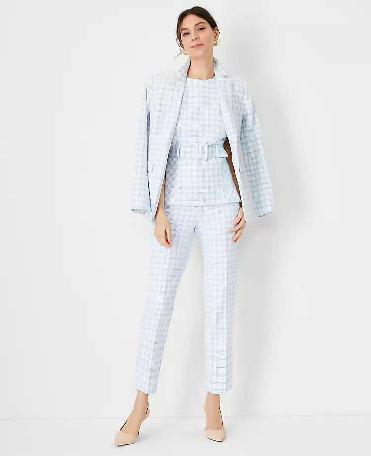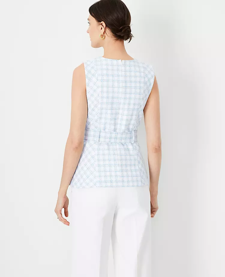 We’ve cinched our breezy plaid top with a slim buckle belt, for a sleek and stylish silhouette. Crew neck. Sleeveless. Self tie buckle belt. Hidden back zipper with hook-and-eye closure. Lined.