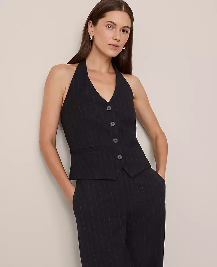 Shaped with a fresh halter neck and defined waist, our bi-stretch vest elevates pencil skirts and fluid pants alike. Halter V-neck. Front value closures. Front welt pockets. Lined.
