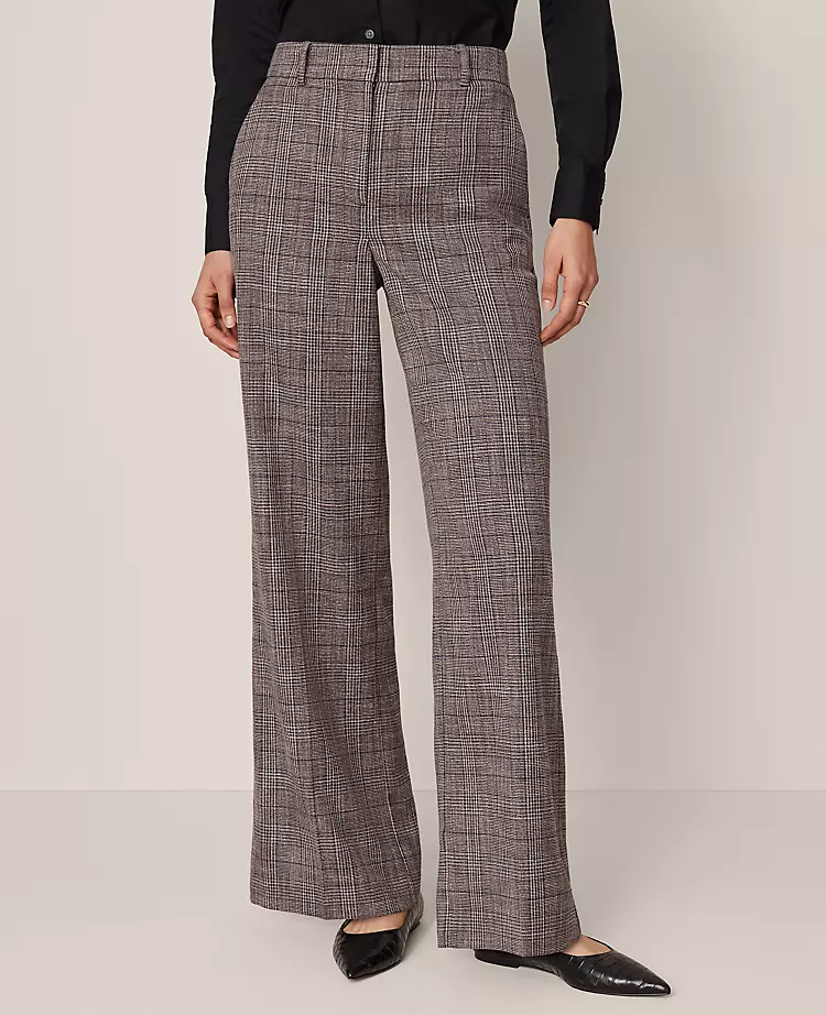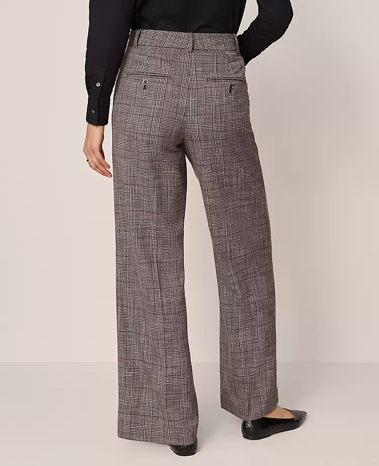 A modern must-have with a statement leg and flattering high waist. Front zip with a hook-and-bar closure. Belt loops. Front pleats. Front off-seam poclets. Back besom pockets.
