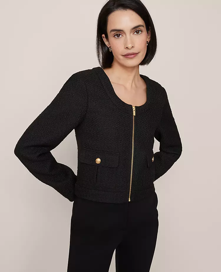 Elevate your professional and evening wardrobe with this sophisticated black tweed cropped jacket. Designed to solve the dilemma of finding a versatile layer that works for both office hours and after-work events, this piece offers an instantly polished look with its structured silhouette and classic texture.